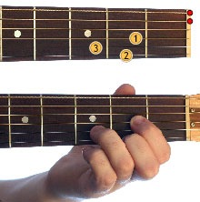 Position each finger with care, according to the above diagram. Make sure that each fingertip is placed directly behind the fret. Firstly, pluck across the strings one by one with your right hand, checking that each string rings clearly and is not muted or buzzing. Play the first Audio or video example to hear how the chord should sound.
