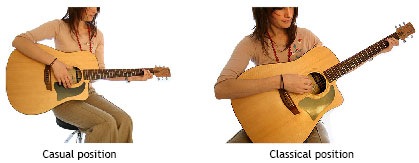 There are two sitting positions for holding the guitar; classical and casual.