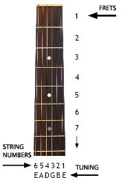 Ok. That aside, let’s get started on the lesson. To start with, I want you to have a look at the guitar neck diagram below and make note of all the relevant pieces of information.