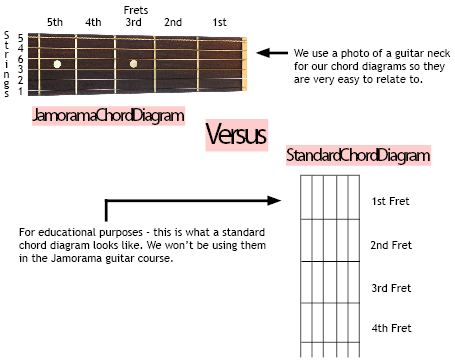 As stated above the Jamorama chord diagrams are going to be pictures of an ‘actual’ guitar neck so it’s easy to make the connection between strings and fingering. There is also a picture of the type of chord diagram that appears in most other Guitar learning guides. I want you to be aware of that form of ‘standard’ chord diagram because you may want to use it when writing up chords on paper at home.