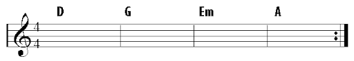 Position each finger with care, according to the A Major chord diagram (above). Make sure that each fingertip is placed directly behind the fret. Firstly, pluck across the strings one by one with your right hand, checking that each string rings clearly and is not muted or buzzing. Once you are sure that you are holding the A major chord correctly, practice strumming the chord in single downward strokes as indicated below: