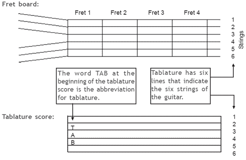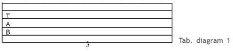The 3 on the above tablature score (Tab. diagram 1) indicates to you that you place a finger on the third fret of the sixth string. It is the note G.