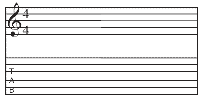 Often tablature is written beneath traditional music score or stave. The two together looks like this: